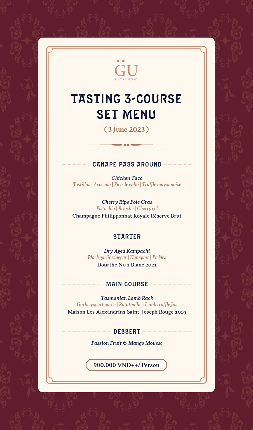 Inclusive of 3-course set menu and wine pairing
