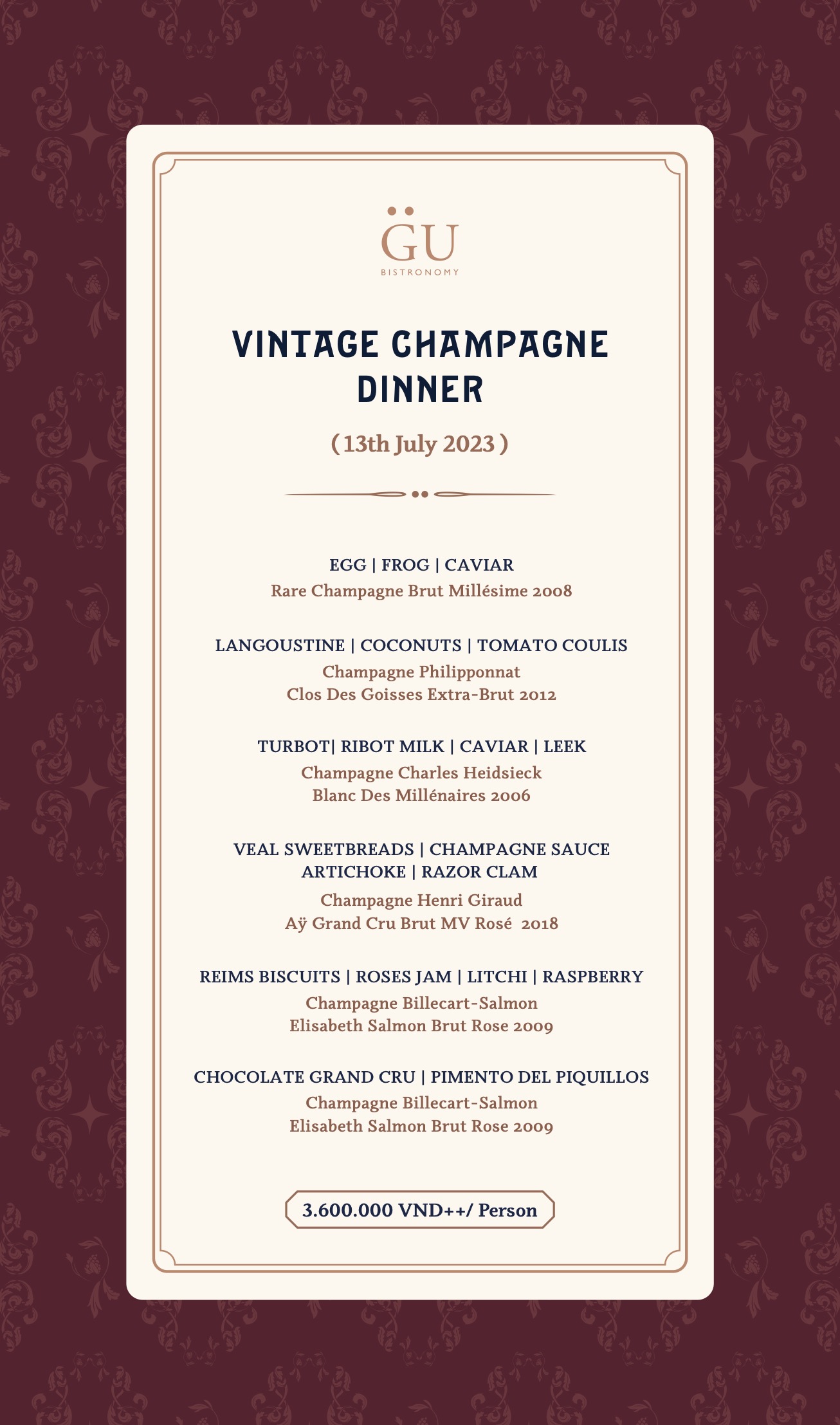 Price: 3,600,000 VND++/person inclusive of 6-course set menu & wine pairing. Time: 6:30 PM | 13 July, 2023